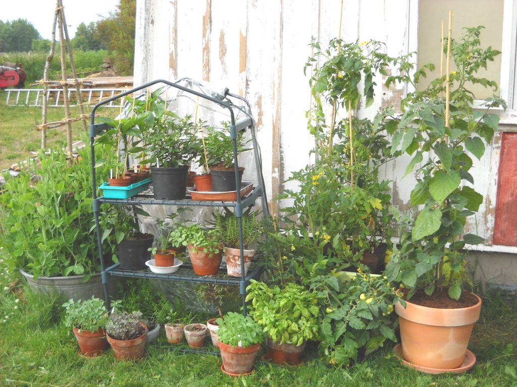 Chili, paprika, tomat, physalis, div kryddor mm längs södergaveln.