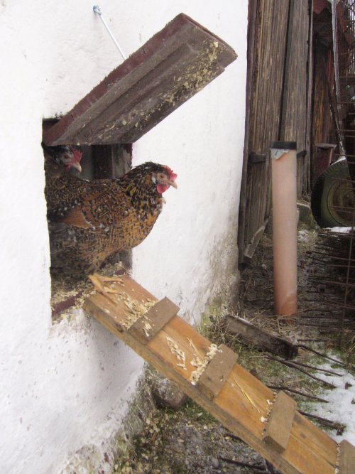 Ungefär så här långt ville pullorna idag. Gudrun på trappen och Frida bakom. Inte ens godis lockade ut dem i snön...