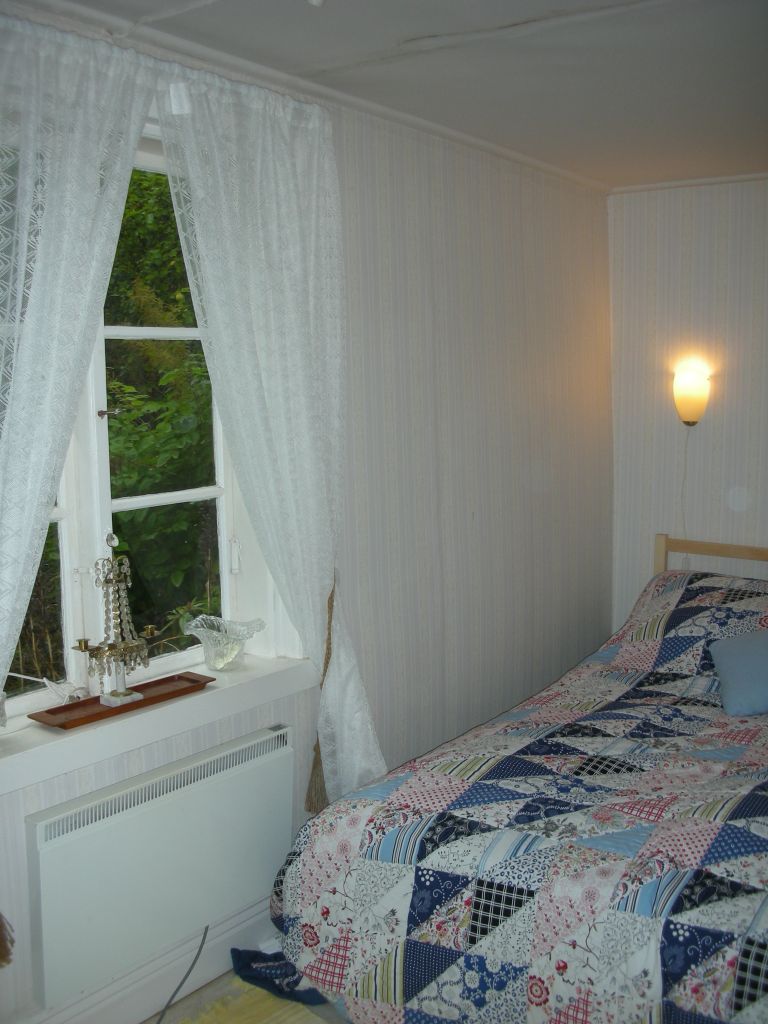 Efter lite trixande fick vi plats med dubbelsängen i den lilla kammaren, visserligen åt ett annat håll än tänkt men helt okej ändå. Tyvärr är kaminen inte godkänd att elda i så elradiatorn måste kanhända användas under kyliga nätter. I alla fall tills vi ordnat något bättre.