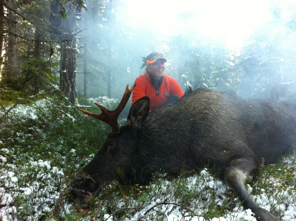 Tyvärr hukar hunden bakom själva älgen. Men ni ser väl va jävla glad jag är? Och det är inte krutrök, det är surved som brinner...