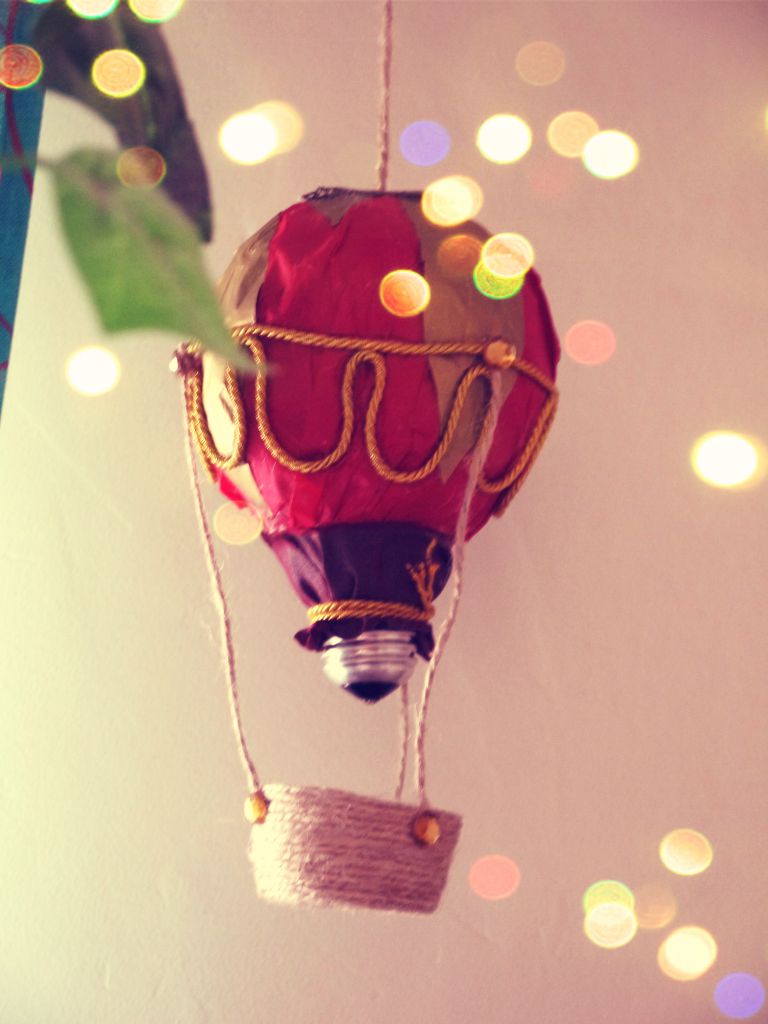 Gjord av en glödlampa, en plastmugg, snören, silkespapper och lite dekorstenar..