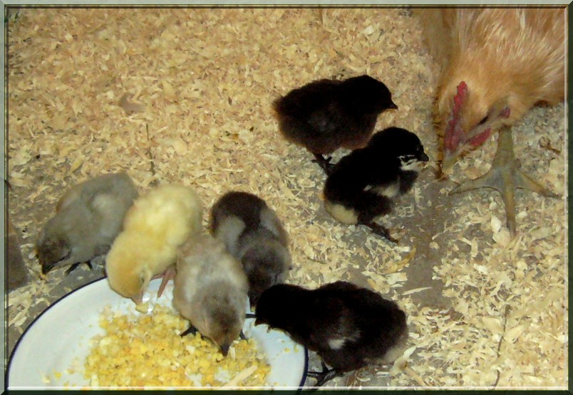 Nykläckta små hedemorakycklingar i härligt varierande färger, som äter sitt livs första mål mat.