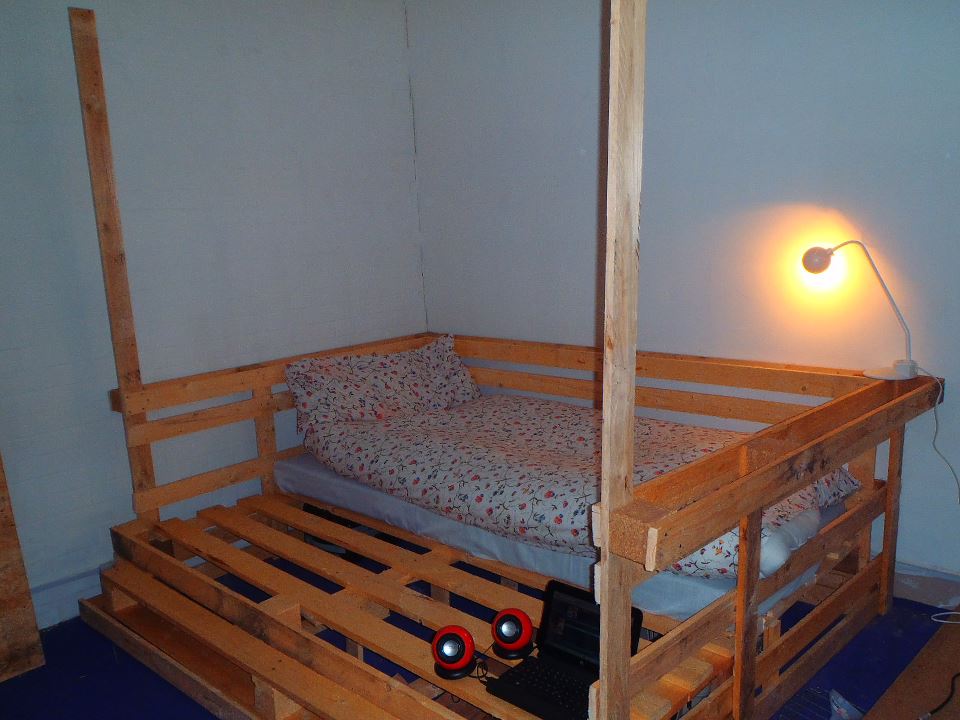 Efter en vadslagning i London mellan mig och några brittiska killar om att jag, den lilla svenska tjejen med målade naglar absolut inte kunde bygga något, byggde jag denna dubbelsängen av gamla använda pallar. Detta var innan den målades vit. Stolparna är början på en "himmelsäng". Tji fick dom!!