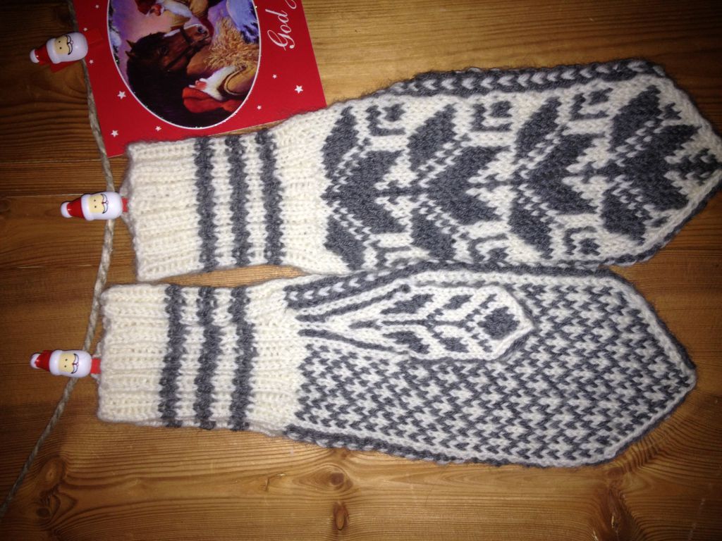 Här ett par ullvantar mönsterstickade efter gammalt norskt selbumönster.