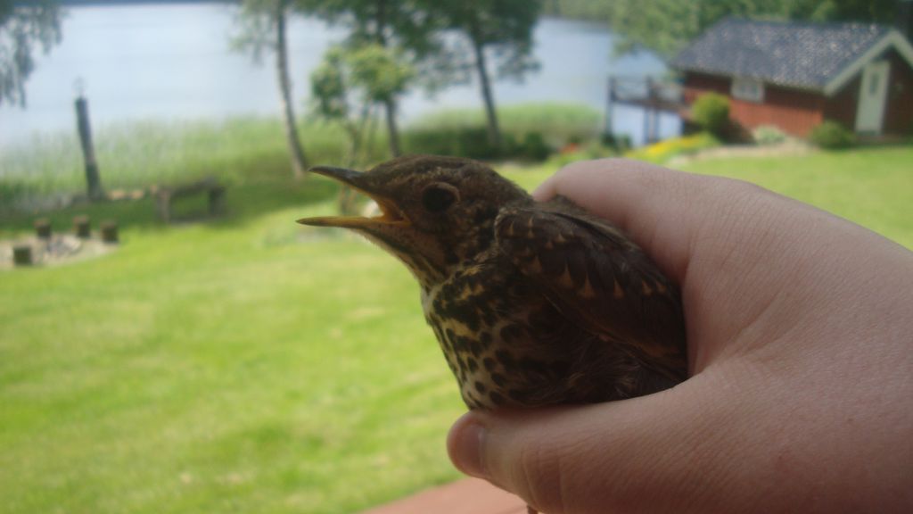 Denna trasten flög in i mitt fönster idag, nu sitter den i en mörk låda och jag hoppas den piggnar till..