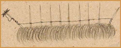 När man laggt på första varvet med stora fång av förtorkat gräs och sedan linda på tråden för nästa varv så vardet viktigt att det var minst en dryg handbredd mellan ... gräset och nya varvet tråd...