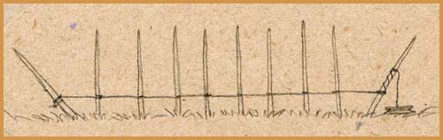 Knyt fast ett kraftigt snöre/tunt rep eller en galvaniserad järntråd (svårarbetat) runt första stören cirka 40-50 cm över marken. Dra den vidare till nästa stolpe, vira ett varv och fortsätt på samma sätt till sista stören. Där virar du några varv extra och sen virar du upp den cirka 40-50 cm högre upp på stören och fäster den där.