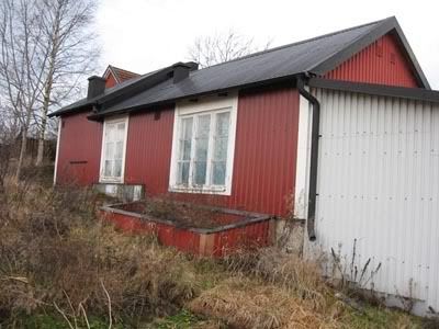 Stugan är på 20 kvadratmeter. (Inge vidare snygg modell.) Fasaden klädd med plåt.