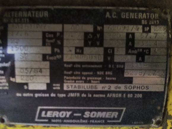 Spänning och ström?  Det är ett trefas traktordrivet verk. Leroy-Somer heter det, det står 16 eller 17 kwa på det om jag minns rätt.